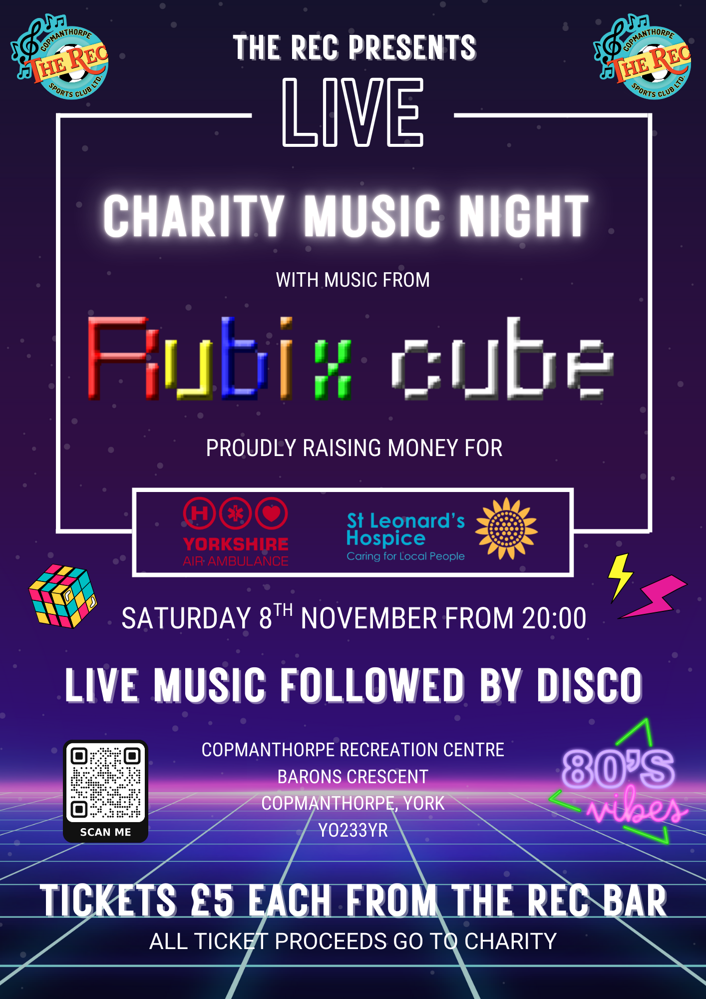 NEW FOR 2025 - Charity Music Night with Rubix Cube raising money for St Leonards Hospice & Yorkshire Air Ambulance. Tickets £5 each - all to charity. Tickets available NOW from the Rec Bar, or email us at thecoprec@gmail.com
