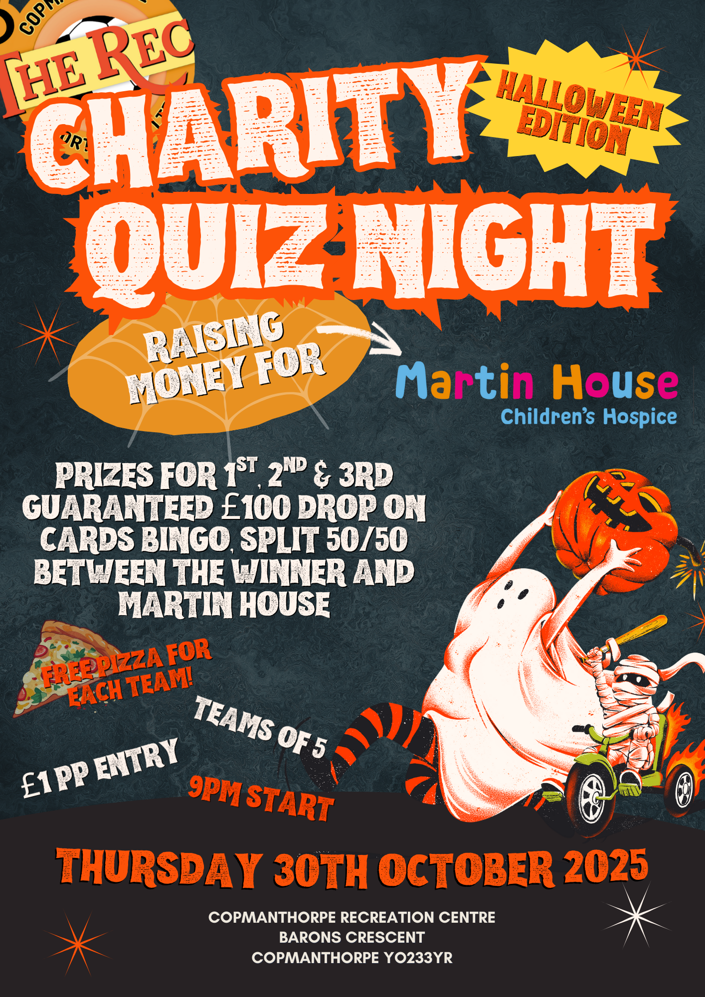NEW FOR 2025 -Halloween Quiz Night raising money for Martin House Children’s Hospice. Prizes for 1st, 2nd & 3rd with a guaranteed £100 drop on cards bingo, split 50/50 between the winner & Martin House. £1pp entry.
